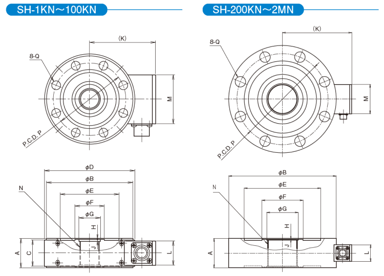 | SH-100KN | 100 kN | 34 | 117 | 31 | 121 | 82 | 46 | 34 | 1/2 | 81 | 22 | 50 | M32×2 | 100 | 8-Φ11 | 16 kHz | 2.2 kg |