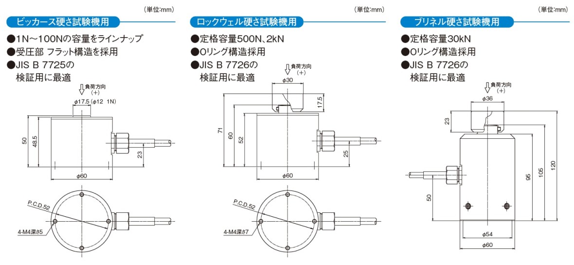 | RCF-50KN | 50 kN | φ 60 | 125 mm | 2.4 kg | ブリネル硬さ試験機 | RCF型 力計荷重変換器 |