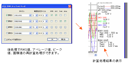 リアルタイム又は、後処理での波形解析ができます。 - 後処理での任意のフィルタ追加や、再計算処理もできます。